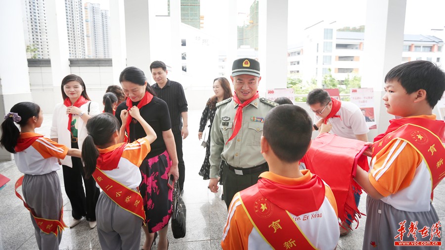 活动现场,长沙少年政治军校第一任校长曾林英把象征着少年军校精神的校旗交到育新二小校长漆伟英手上,全体同学起立,向校旗庄严敬礼。