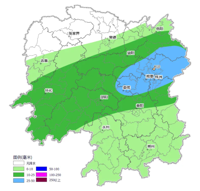 具体来看,25日晚至26日白天,永州、郴州、株洲南部多云转阵雨或雷阵雨,其他地区阴天有小到中等阵雨或雷阵雨,怀化中南部、邵阳北部、娄底东部、长沙、湘潭、岳阳、株洲北部部分大雨,其中岳阳南部、长沙东部局地暴雨。26日晚至27日白天,湘北多云,其他地区阴天有小到中等阵雨或雷阵雨,湘中偏南部分大雨,其中怀化中南部、邵阳西部、衡阳北部、娄底东部、湘潭、株洲中部局地暴雨。27日晚至28日白天,湘西土家族苗族自治州北部、张家界、常德北部多云间阴天,其他地区阴天有小到中等阵雨或雷阵雨,其中娄底东部、湘潭、长沙、株洲北部局地大雨。