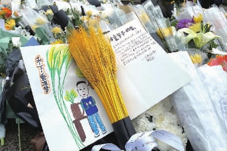华声在线5月23日讯 今日上午,湖南杂交水稻研究中心,吊唁厅前的楼梯上,摆满了人们悼念袁隆平院士的鲜花。百花丛中,一捧金黄的稻穗和一张笔迹稚嫩的《禾下乘凉梦》儿童画格外醒目。这是长沙9岁女孩张慕辰花了一个晚上,精心为袁隆平院士准备的。