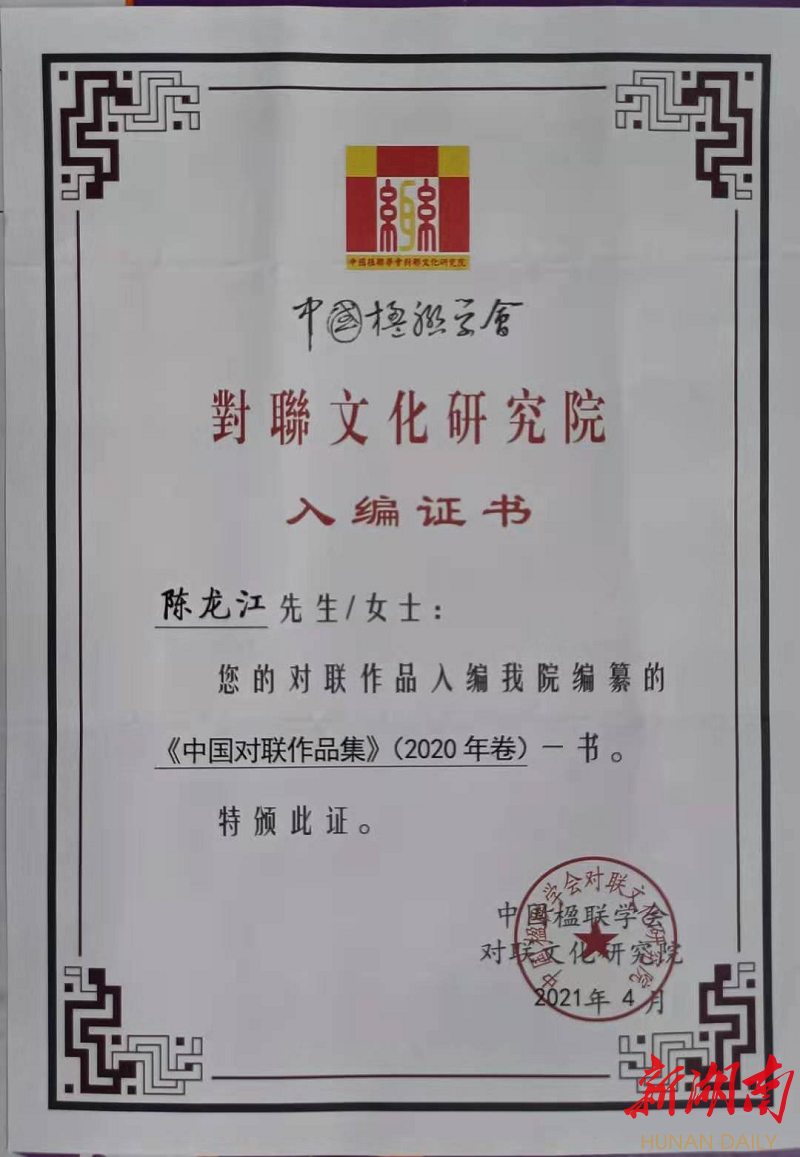 华声在线5月13日讯(湖南日报·华声在线见习记者 周磊 通讯员 朱淆燕)5月11日,中国对联作品集编委会传来消息,平江县政协常委、香韵书画艺术学校校长、书画家陈龙江创作的“五载担当使命;一生不忘初心。(题政协届满)”“登峰望岳;观海听涛。(题天岳幕阜山)”等15幅楹联作品全部入选《中国对联作品集》。这是陈龙江楹联作品继2020年之后再次入编《中国对联作品集》。