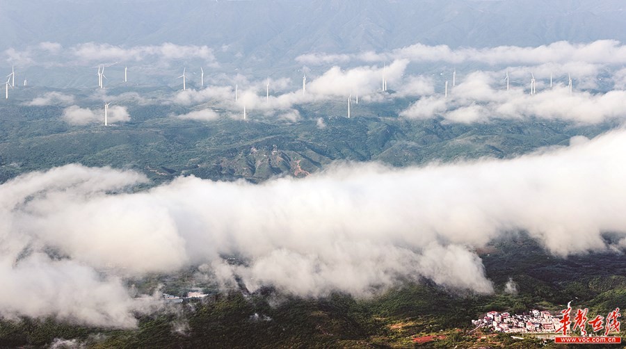 5月13日,临武县通天山大冲段风电场,风电塔在云雾中蔚为壮观。近年,该县大力发展风电产业,高创、华润等风电场的风电机组风车飞舞,绿色能源源源不断输向各地。陈卫平 摄