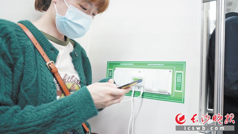 目前,长沙地铁已在1号线、2号线部分列车试装免费“车载手机充电装置”,该装置位于各节车厢连接处,乘客可以根据需要,选择合适的数据线为手机充电。