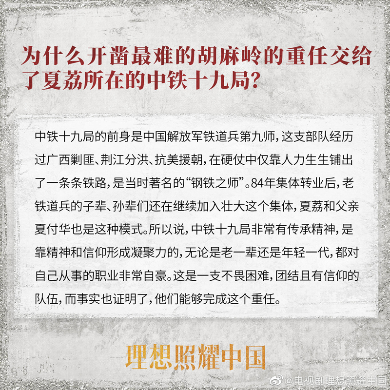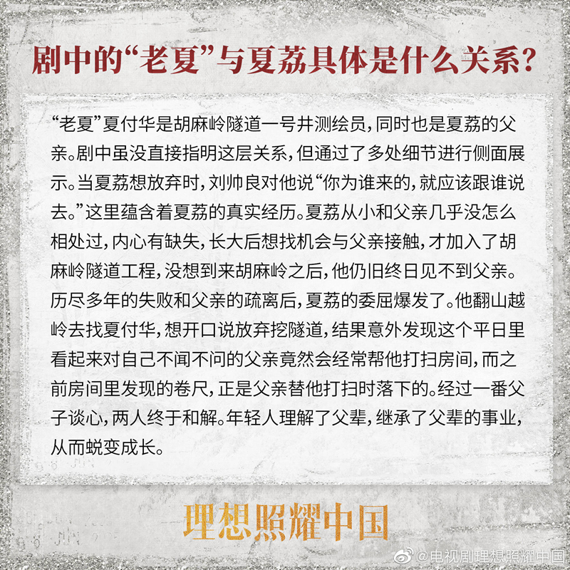 华声在线5月11日讯(湖南日报·华声在线记者 邓正可)当人们乘坐高铁动车飞驰在祖国大地时,很难想象纵贯南北的兰渝铁路建设曾因为173米的“豆腐土层”一度停滞。这条总里程800多公里的铁路线穿山越岭,有226座隧道,其中就有被称为“鬼门关”的胡麻岭隧道。《理想照耀中国》最新播出的剧集《173米》中,再现了夏付华(田小洁饰)、夏荔(张云龙饰)父子分隔6年勇闯“鬼门关”的故事。