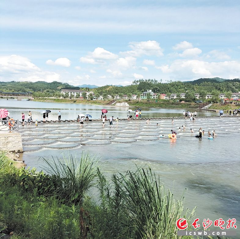 端午期间,不少游客带着孩子在鱼鳞坝玩水。长沙晚报通讯员 刘婷远 摄