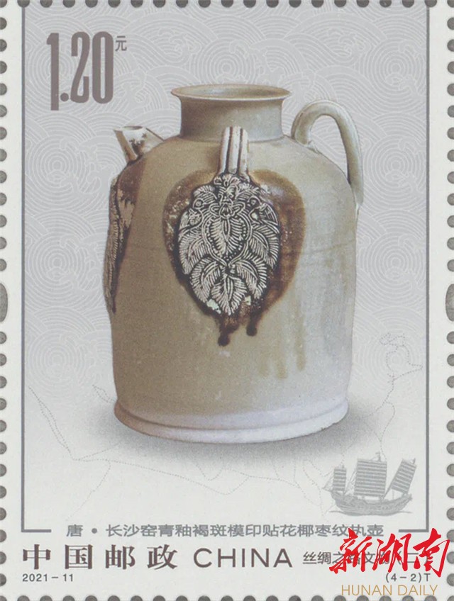 本套邮票包含《汉•凸瓣纹银盒》、《唐•长沙窑青釉褐斑模印贴花椰枣纹执壶》、《五代十国•波斯孔雀蓝釉陶瓶》、《宋•龙泉窑青釉菊瓣纹盘》,其中第二枚《唐•长沙窑青釉褐斑模印贴花椰枣纹执壶》邮票上的原型文物就藏于长沙铜官窑博物馆。该执壶为国家一级文物,于1988年从“黑石号”沉船上被打捞出水,并于2017年“回归”铜官,邮票画面色彩淡雅,细腻地刻画出文物的质感和美感。据了解,这是长沙铜官窑首次以“国家名片”形式向世人展示海丝文化内涵,也是时隔九年长沙再次发行的地域文化主题邮票。