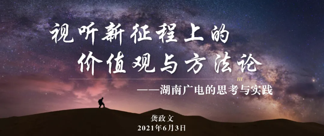 以“十四五”规划的开启和中办国办《关于加快推进媒体深度融合发展的意见》的出台为标志,中国视听行业踏上新征程。这注定是一条充满光荣与梦想的征途。在我们面前,有着充分的确定性,也有着巨大的不确定性;有着宝贵的机遇和各种可能性,也有着艰难的挑战和艰巨的任务。那么,广电人何为?视听从业人员何为?下面,我主要从价值观和方法论两个方面向各位汇报湖南广电的思考与实践。