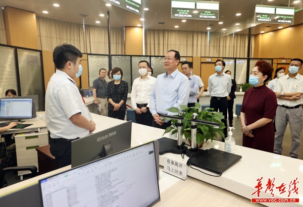 (6月1日上午,省委副书记、省长毛伟明赴省政务局调研。图为毛伟明在政务服务大厅与工作人员交流。)