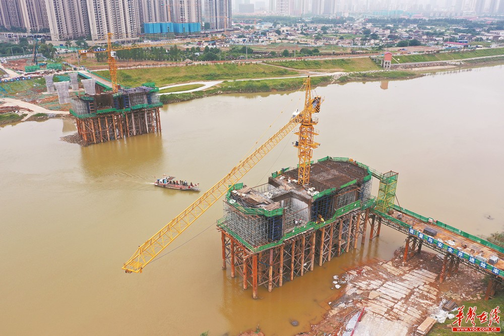 5月31日,长沙花侯北路浏阳河桥项目工地,工人正在进行现浇箱梁施工。该桥南起合丰路,北至望龙路,全长1745米,双向六车道,设计时速50公里,为城市主干道。该桥投入使用后,将优化长沙城东交通环境,方便市民出行。