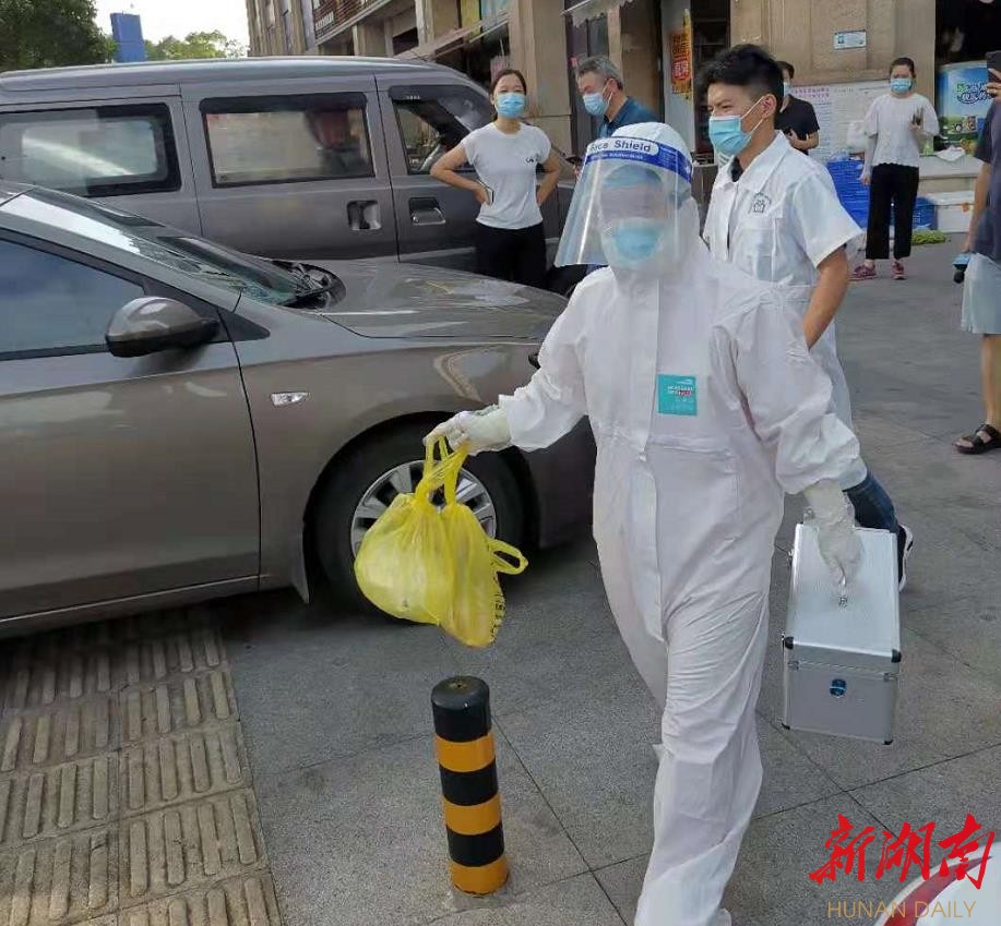 7月31日17时许,记者在株洲市云龙示范区凯风珑城小区门口见到罗丹时,她刚和搭档谢湘波上门完成一户居家隔离人员的核酸检测。