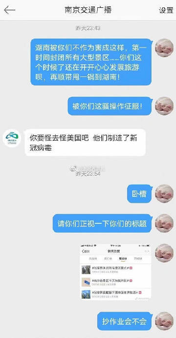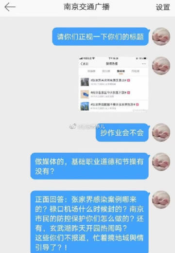 更有甚者,南京交通广播适时发文《全国多地出现与张家界旅游关联病例》,居然对“南京”二字只字不提,完全甩锅给张家界!某些媒体,请端正你们的行为和态度,不要一味推卸责任,装癫装疯。请让你们的家人和全国人民为你们的行为感到骄傲和放心!而不是钉在历史的耻辱柱上!