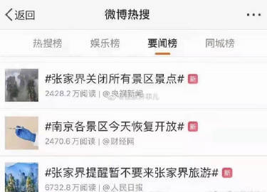值此艰难之际,令人心寒的是南京、张家界两地应该团结一心,全力抗疫,然而张家界在对外宣布关闭全市景区景点之时,却发生令国人震惊和不解的事,咱南京竟然宣布各景区恢复开放!!同时还上了热搜榜,且排名不分伯仲,实在是巧合?火烧眉毛了,你们还如此心大?
