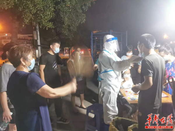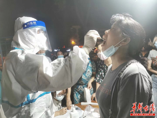 7月29日深夜,在宁乡一小区内,社区工作人员耐心引导排队,为了让大家安心排队等候检测,唱起《相亲相爱一家人》《感恩的心》等歌曲;医务人员顶着高温穿着防护服在社区为市民做核酸检测,市民想方设法为医务人员降温,有人从家里搬来冷风机和电风扇到检测点,有人站到医务人员身旁用折叠起来的纸箱为其扇风;核酸检测后,医务人员和市民互相比心,加油鼓劲......医务人员用汗水和坚持为阻断疫情传播尽着最大的努力,他们拼在“一线”感动着每一个人。