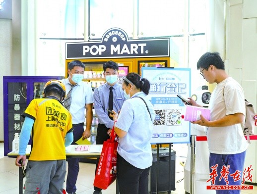7月28日,在长沙某商场入口处,供消费者扫码出示健康码的二维码提示牌非常醒目,门口有专员查验市民的健康码。顾荣 摄