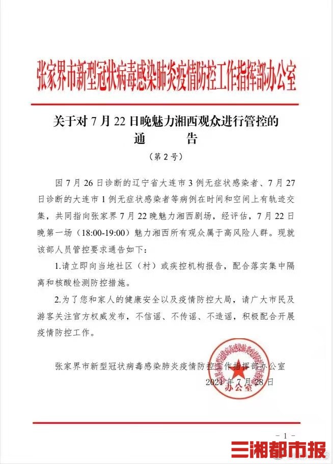 华声在线7月28日讯(三湘都市报·华声在线记者 李琪 实习生 杨祎莎 整理)今天,张家界发布关于对7月22日晚魅力湘西观众进行管控的通告:因7月26日诊断的辽宁省大连市3例无症状感染者、7月27日诊断的大连市1例无症状感染者等病例在时间和空间上有轨迹交集,共同指向张家界7月22日晚魅力湘西剧场,经评估,7月22日晚第一场(18:00-19:00)魅力湘西所有观众属于高风险人群。现就该部人员管控要求通告如下: