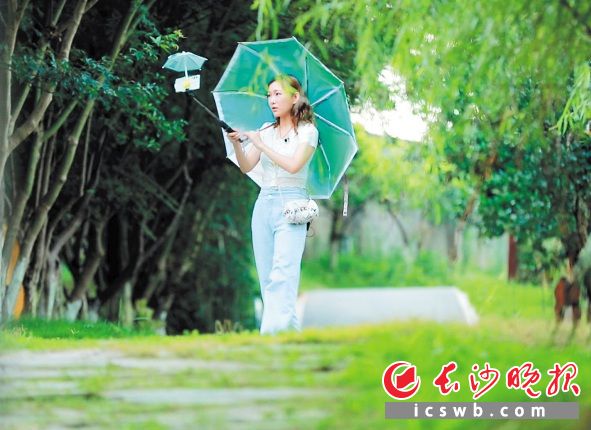 面积约200亩的虎园,不少游道两侧都有树,但她直播时,仍会经过不少太阳直晒的地方。哪怕自己不打遮阳伞时,她也不忘给持续运行的手机准备“防暑神器”——微型遮阳伞装着手机上方,还不时用降温喷雾喷手机,以防手机过热导致直播卡顿。
