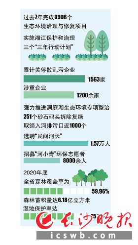 “过去7年完成3906个生态环境治理与修复项目;实施湘江保护和治理三个‘三年行动计划’,累计关停散乱污企业1563家,涉重企业1200余家,湘江干流省控监测断面水质达到Ⅱ类。”省生态环境厅党组书记、厅长邓立佳介绍。
