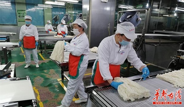 “一碗粉在端到市民面前时,需经过了米的浸泡、磨浆、滤水、蒸熟、切条、运送……”银洲米粉董事长刘建桥告诉记者,随着疫情好转,银洲米粉的12条生产线也逐步开启。从磨浆、蒸粉、切粉到包装,由机器全自动完成,有效避免员工聚集,并能确保米粉安全生产。