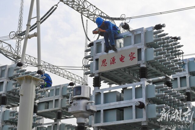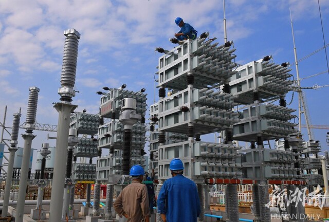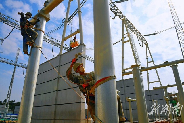 8月20日,长沙县安沙镇,湖南首台特高压变压器开始设备安装。南昌-长沙1000千伏特高压交流工程新建长沙、南昌两座特高压变电站,线路2*345.2千米,将构建雅中直流返送湖南通道,为湖南提供重要能源保障。湖南日报·华声在线记者 徐行 通讯员 宋晓明 摄影报道