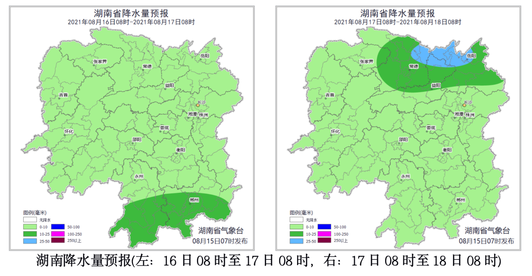 17日,多云,大部分地区有阵雨或雷阵雨,湘北部分中雨,其中常德东北部、益阳北部、岳阳北部局地大雨(图3右)。