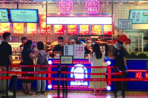 在荷花路上的一家墨茉点心局门店内,店员边熟练地包装好糕点边介绍,咖啡麻薯和超级芝士脆都是明星单品,很多新顾客都成了回头客,有不少人一次买十几袋。“以前一天能卖出去300多份,排队也是经常的事。”