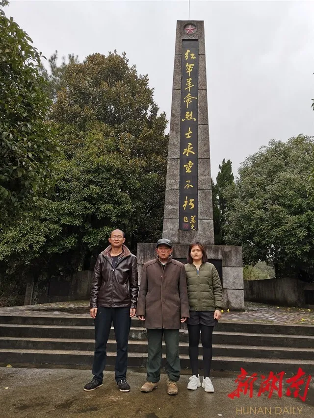 △第三代人王水洪(中)与第四代人王军在烈士墓前