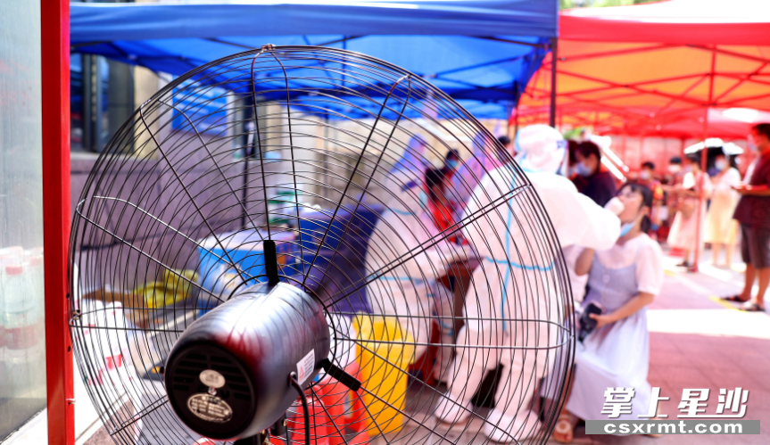 图为开元路社区在采样点现场设置了两台排扇给一线工作人员降温。 盛磊 摄