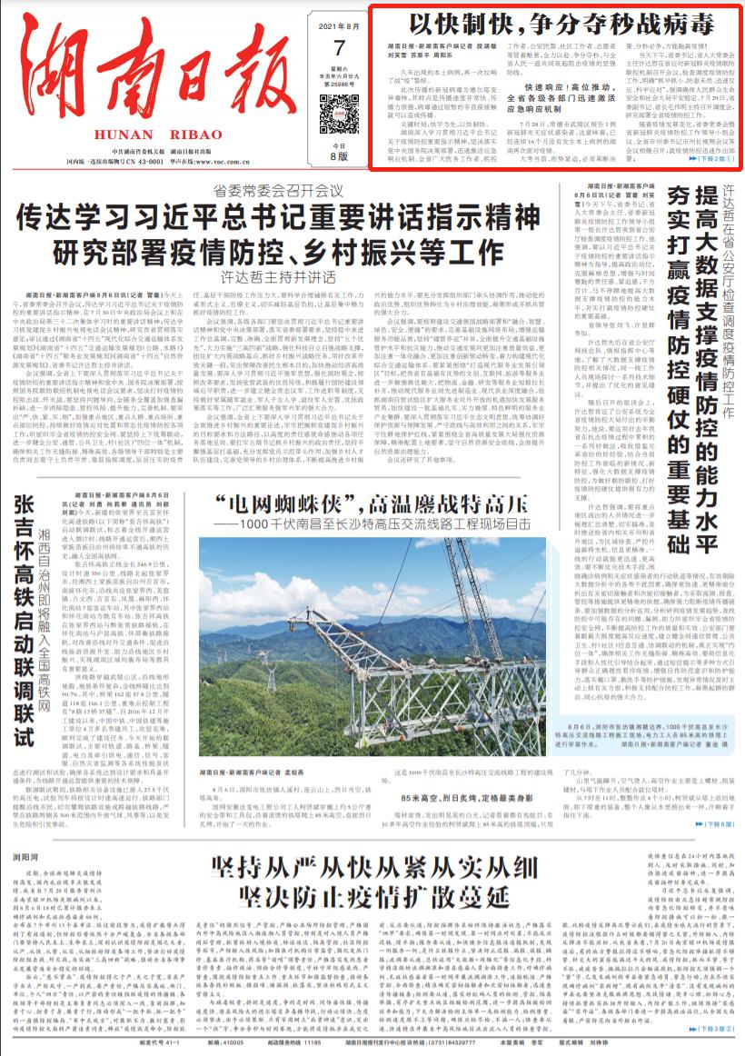 8月4日,国务院联防联控机制电视电话会议召开后,许达哲紧接着主持召开会议部署全省疫情防控工作,强调要突出一个“快”字,在应急响应、信息报送、开展流调、核酸检测、隔离救治、区域协查、疫苗接种等各环节中突出快的要求,坚决打好疫情防控这场硬仗。