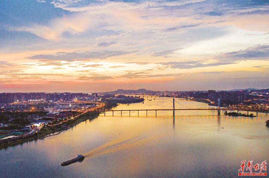 8月5日傍晚,雨后长沙出现美丽晚霞,给湘江及两岸染上了一层绚丽的色彩。