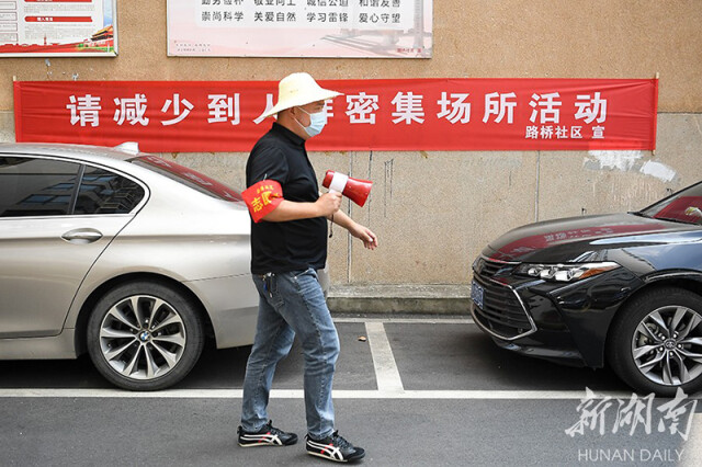 (8月3日,长沙市雨花区雨花亭街道路桥社区,社区工作人员利用小喇叭进行防疫知识宣传。湖南日报·华声在线记者 傅聪 摄)