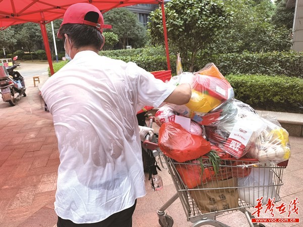 “4号栋的物资都在这里吧?那我们现在装好往居民家送。”8月4日,顶着高温,长沙宁乡未来方舟小区的志愿者杨小军戴着口罩、经过严格防疫措施后,驾驶着装着食用油、大米、水果等生活物资的电动摩托车,向小区内4号栋驶去。这是他和队友们志愿服务的第六天。