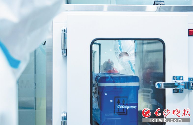标本放置在专用转运箱里通过专用通道被护送到实验室,开箱前工作人员用酒精喷雾消毒,并确认相关信息。