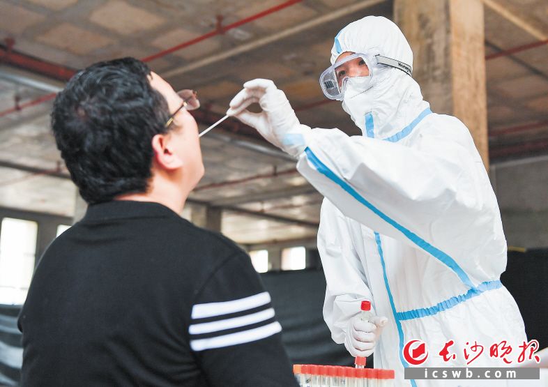 8月2日,长沙金域检验中心,医务人员正在核酸检测采集点为被检者进行咽拭子样本的采集。