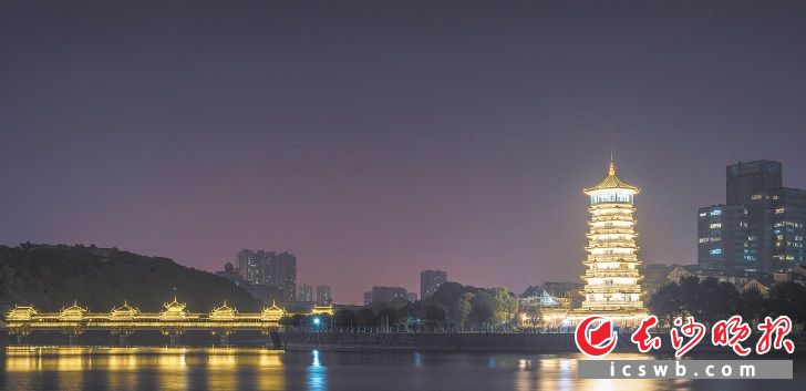 潇湘阁被点亮,成为夜间烈士公园的一道风景。