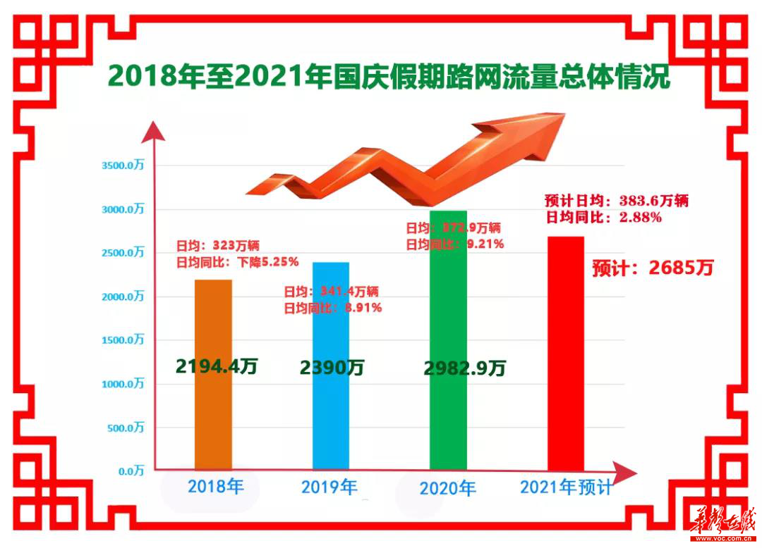 预计全省高速公路出入口总流量达2685万辆,日均流量约383.6万辆,为日常流量的1.8倍,与2020年同比日均增长2.88%。预判峰值日出现在假期首日(10月1日),峰值流量达465万辆,略高于2020年同期,同比增长1.1%,10月2日流量次之。