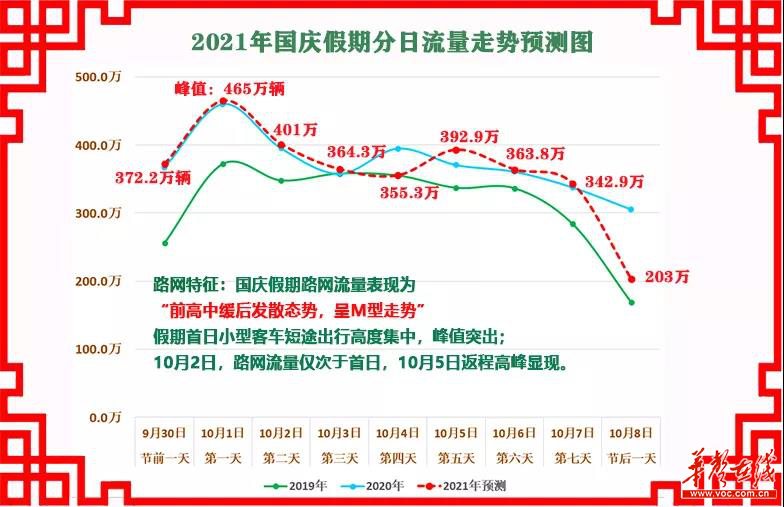 10月1日,免费通行第一天,预测当日为流量峰值日,峰值流量达465万辆,预计峰值时段出现在8时至11时和14时至18时,午间流量稍有回落。全天中短途自驾车流叠加客货车流,路况复杂,交通安全风险较大。