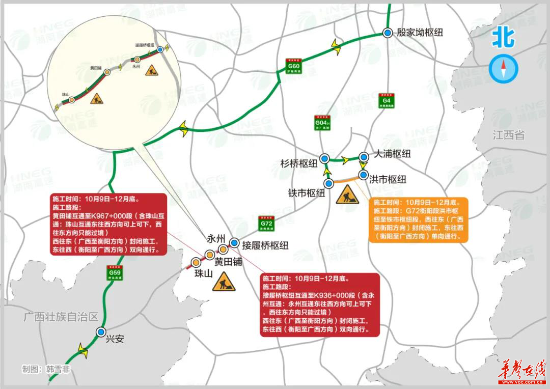 (1)洪市枢纽互通至铁市枢纽互通段:南半幅封闭施工,东往西方向(衡阳往永州方向)正常通行,西往东方向(永州往衡阳方向)禁止通行。