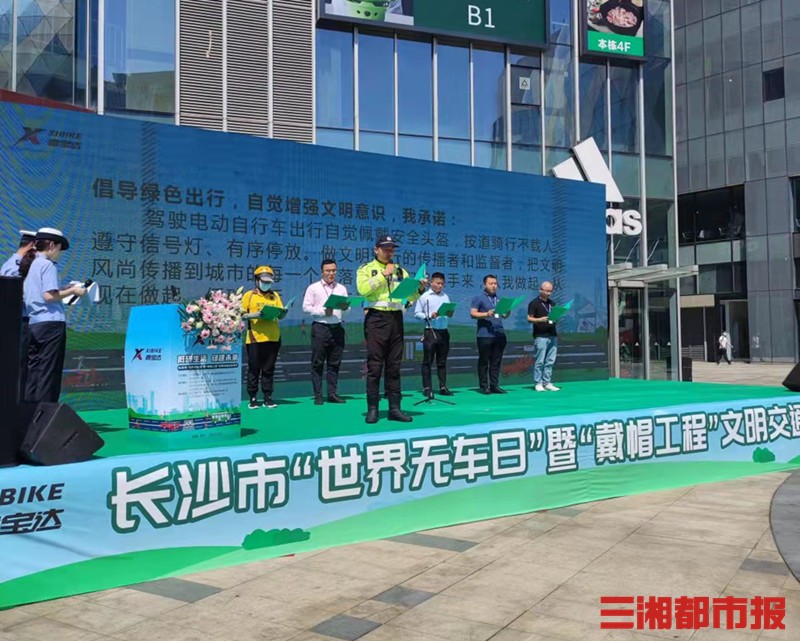 第23个“世界无车日”,今天上午,长沙市“世界无车日”暨“戴帽工程”文明交通实践活动举行,长沙交警现场演示不戴好头盔就无法骑行的共享电单车“黑科技”。