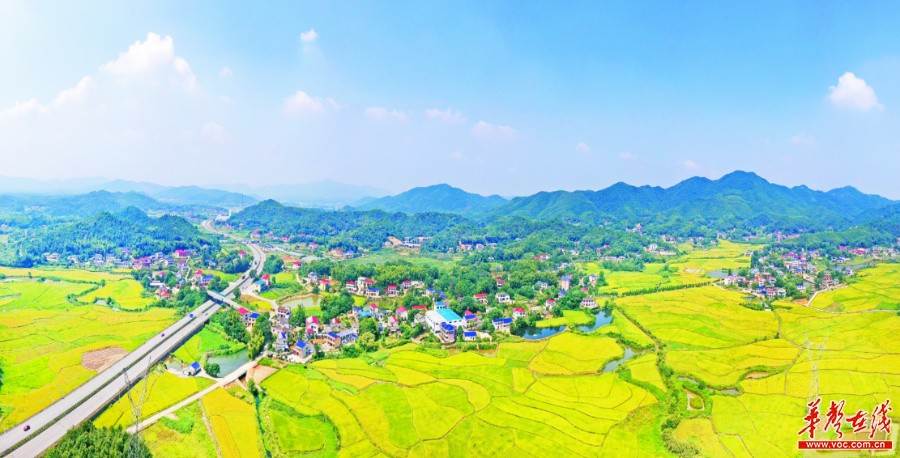 9月12日,长沙市岳麓区雨敞坪镇,渐黄的稻田与村庄交相辉映,构成一幅色彩斑斓的丰收画卷。近年,我省大力建设高标准农田,加快推广“高产、优质、抗性强”的水稻新品种,确保了粮食播种面积和总产量的“双增”。湖南日报·华声在线记者 李健 摄