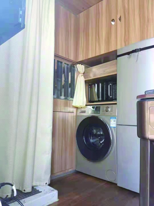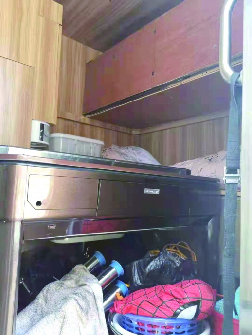 车厢里挨着车头的一边是可以折叠的高低床,紧挨着床的是一排柜子,里面嵌入了冰箱、洗衣机、微波炉。柜子对面还装有电视机。车里还有简易的浴室,装了莲蓬头。而车辆尾部则是巨大的太阳能电池板,以及可以拓展为阳台的厚板。厨房也设置在了尾部。在车厢正中间,一台麻将机特别显眼。易先生说,麻将机平时当桌子用,吃饭、孩子写作业都能用上,想搓麻将的时候还能找人搓两局。为了方便在当地买菜,易先生还把一台电动车带在车上了。为了通风,车辆尾部装了窗户,车厢门则加装了纱门。
