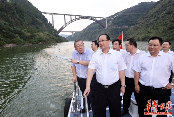 (9月1日,毛伟明乘船沿酉水河调研凤滩水电厂防汛工作。)