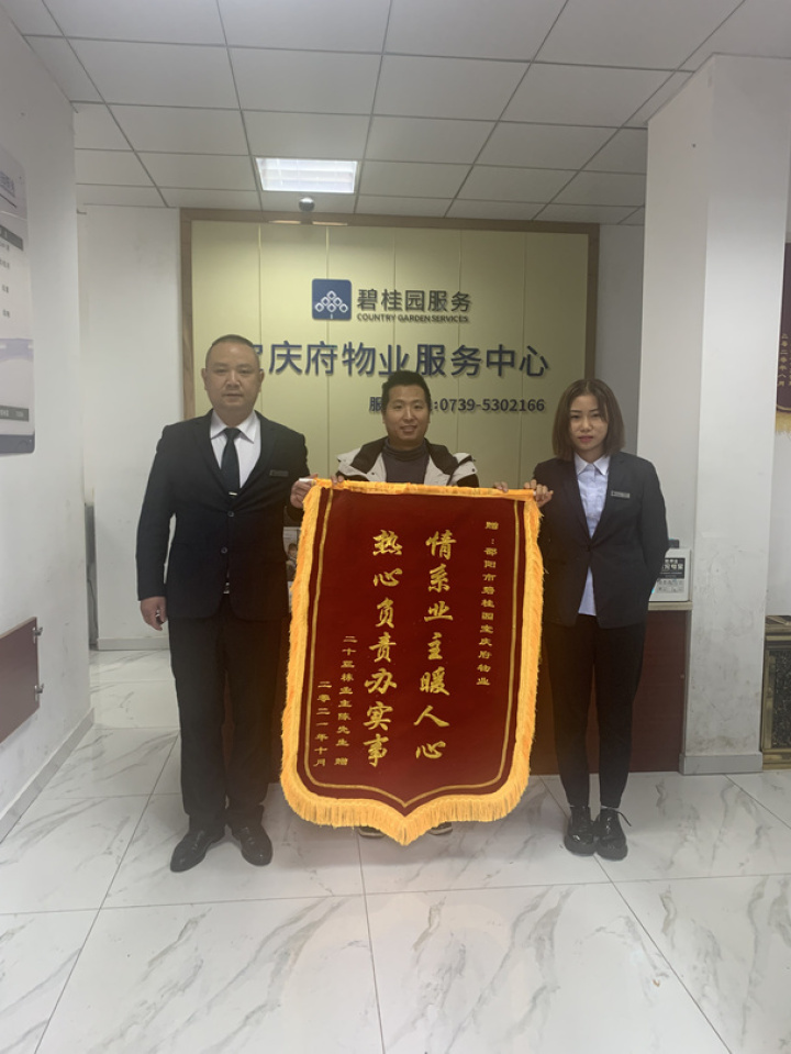 “多亏了你帮我照顾小孩,要是没有你们,我都不知道该怎么办了。住在这里,我们很有安全感!”10月18日,黄女士的丈夫陈先生将一面印有“情系业主暖人心 热心负责办实事”的锦旗送到了物业服务中心,握着刘小明的手连连道谢。