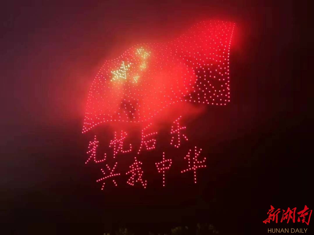 伴随着《爱我中华》的音乐声,975架无人机编队从民本广场上空出发,缓缓飞向岳阳楼景区。时而组成五星红旗,时而摆出“975”字样。当无人机逐层搭建起岳阳楼、再现这座千古名楼的建造盛况时,市民纷纷惊呼感叹。