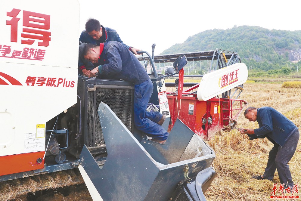 10月18日,新田县三井镇谈文溪村,农机技术人员在田间维修收割机。今年,该县组织农机售后维修工作人员成立志愿者服务团队,深入田间地头,维修保养农业机械。