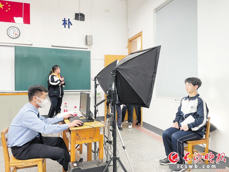 当日中午1时许,在长沙市第一中学的一间空闲教室内,闪光灯、照相机、电脑一应俱全,民警在这里搭建起一个临时“拍照工作室”。