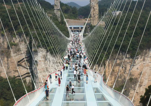 (10月5日,张家界大峡谷景区,游客在高空玻璃桥上游玩。国庆长假,张家界市攀岩、高空滑索、峡谷玻璃桥等运动游览项目受到各地游客青睐,人们沐浴秋日阳光,挑战自我,享受假期户外运动乐趣。吴勇兵 摄)
