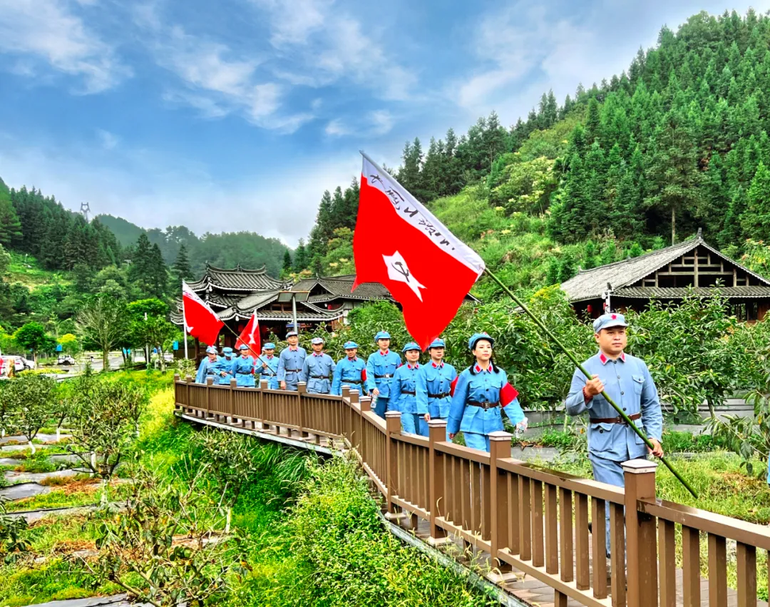(10月7日,游客在通道侗族自治县芋头古侗寨体验重走红军长征路。国庆假期,该县红色旅游再掀热潮,推出的长征“通道转兵”红色主题旅游线路受到游客热捧。陈俊宇 摄)