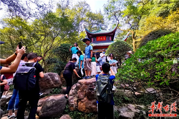 (爱晚亭前打卡拍照的游客络绎不绝。记者 龙腾 摄)