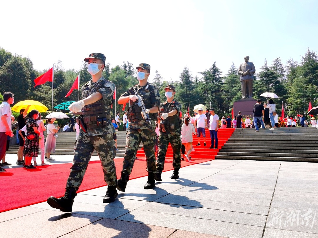 临近12时,由毛泽东主席故居武警警卫班组成的巡逻分队顶着烈日结束了上午景区巡逻任务,3名队员的军装全被汗水浸透。带队干部曾挺表示,参与巡逻的战士全都是“90、00”后,除了日常巡逻外,还要负责毛泽东同志故居24小时站岗和应对景区的突发状况等。“当毛主席故乡兵是责任更是荣誉,我们将站好每一班岗,执好每一次勤,守护人民群众的安全。”曾挺说。