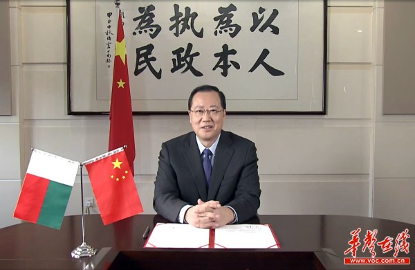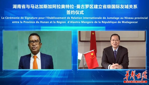 (16日下午,湖南与马达加斯加共和国阿拉奥特拉-曼古罗区通过视频方式缔结友好省区关系。省委副书记、省长毛伟明,阿拉奥特拉-曼古罗区区长拉曼迪阿马纳纳•理查德博士代表双方签署友好省区关系协议书。)