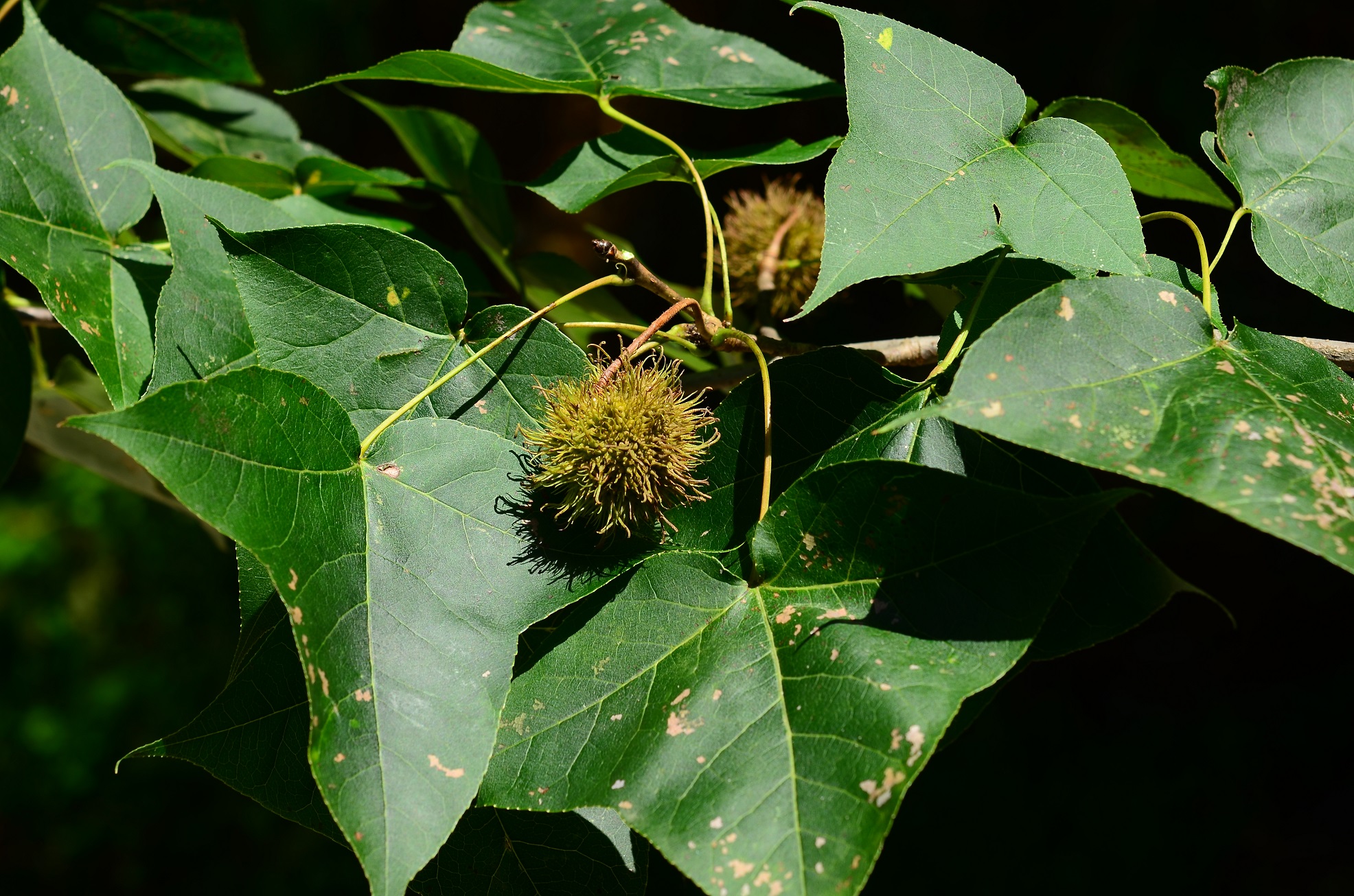 枫香,金缕梅科枫香树属落叶乔木,性喜阳光,高可达30米。树皮灰褐,方块状剥落;小枝干后灰色,被柔毛,略有皮孔;叶薄革质,阔卵形,掌状浅裂;雄性短穗状花序常多个排成总状;头状果序圆球形,直径3至4厘米;蒴果内种子多数,褐色。